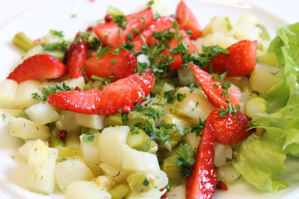 Spargelstangen mit Sauce Hollandaise und Kartoffeln, Spargel-Flammkuchen oder ein sommerlicher Spargel-Erdbeersalat.
